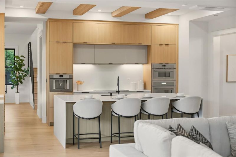 - 220 Volt Outlet, Cooktop - Electric, Countertop - Quartz, Dishwasher, Exhaust Fan, Freezer, Garbage Disposal, Hood Over Range, Island with Sink, Microwave, Oven - Built-In, Pantry, Refrigerator, Skylight, Wine Refrigerator
