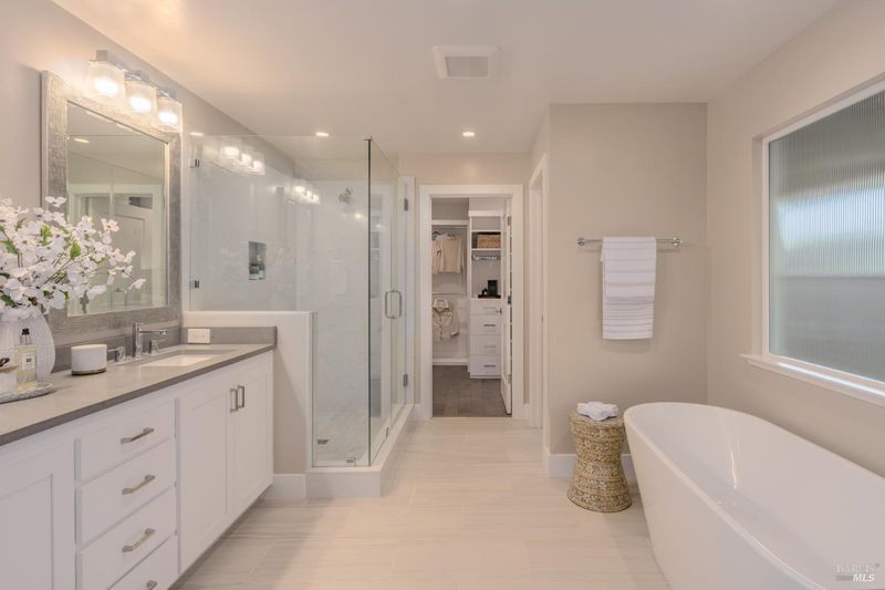 Located on a quiet street in Kenwood, this updated 3-bedroom, 3.5-bath home sits on approximately 0.5 acres surrounded by 23 mature redwood trees with views of Sugarloaf Ridge and nearby vineyards. Remodeled by Synergy Architects and Designers, the approximately 2,200 sq ft residence features classic contemporary styling and an open living, dining, and kitchen area designed for entertaining. Quartz countertops, textured walls and ceilings, a marble and tile fireplace surround, and a suspended kitchen vent hood create distinctive design elements. Large sliding glass doors provide broad access to the spacious backyard dotted with redwoods and peach trees. The front yard features mound gardens and a long paved driveway with embedded lighting. Additional highlights include an attached 3-car garage with epoxy flooring and built-in storage, Bosch refrigerator (2026), new carpeting (2026), Generic generator (2020), water heater replacement (2019), and Nest smart home features.