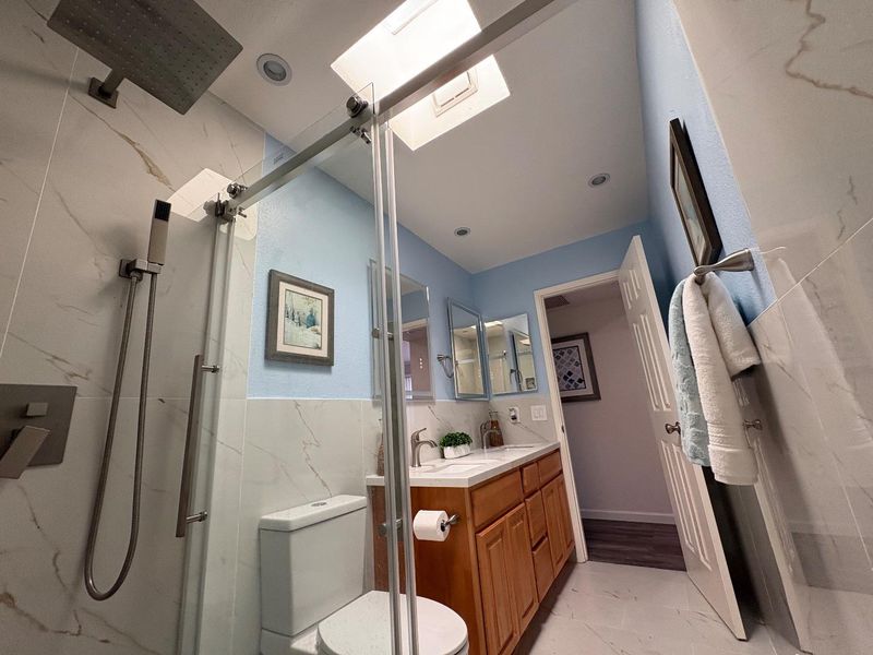 - Double Sinks, Granite, Primary - Stall Shower(s), Skylight, Tile, Updated Bath