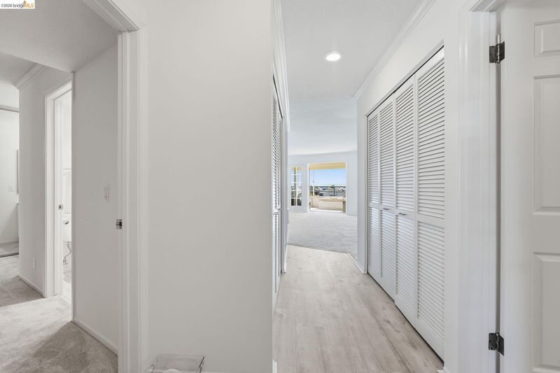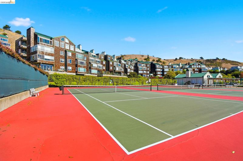 Enjoy the spacious open floorpan of this lovely 2 bedroom, 2 bath, 1421sf “E” plan located in Brickyard Landing, a nestled retreat in the picturesque Brickyard Cove. The glass framed solarium with sweeping views of San Francisco and the Bay allows for complete relaxation while capturing the vibrant sunrises and sunsets from the comfort of your living room. Two spacious ensuite bedrooms with ample closet space, separate toilet rooms, large vanities, one with a walk in shower and the other with a shower over tub. Galley style, all electric kitchen with loads of counter space is a cooks dream. In unit laundry is located in hall closet along with matching closet for more storage. One of the perks of this unit is the private extra storage closet near entry. These buildings all have elevators and community amenities which include a year round heated pool, hot tub, club house, gym, tennis/pickleball courts and locker rooms with sauna’s in each. Below building parking offers two deeded spaces, one with built in storage. Plenty of EV charging stations, community garden area and gated secure parking round out the complex. Just minutes from the quaint town of Point Richmond with it’s Natatorium, grocery stores, restaurants, salons, library, Mechanic’s bank and Masquers Playhouse, 80/580