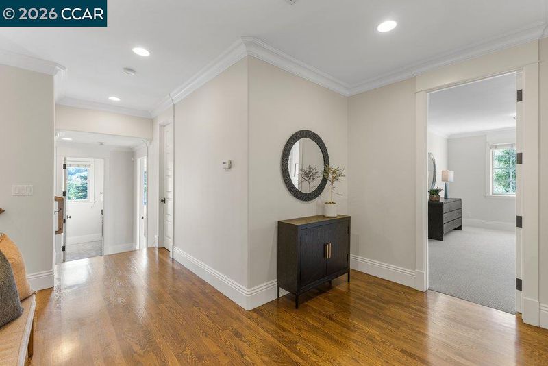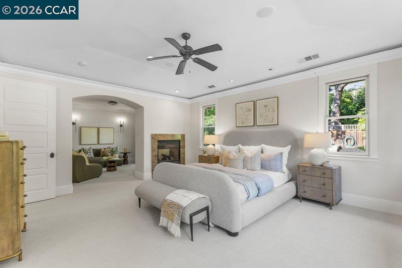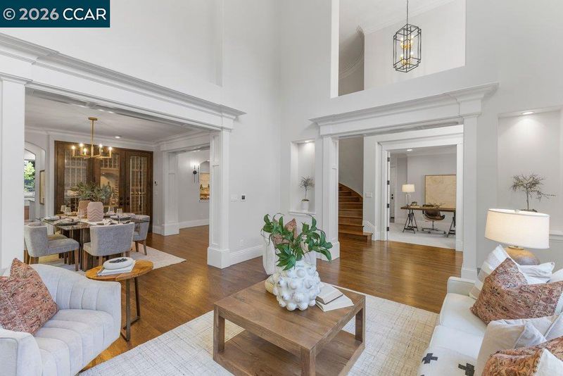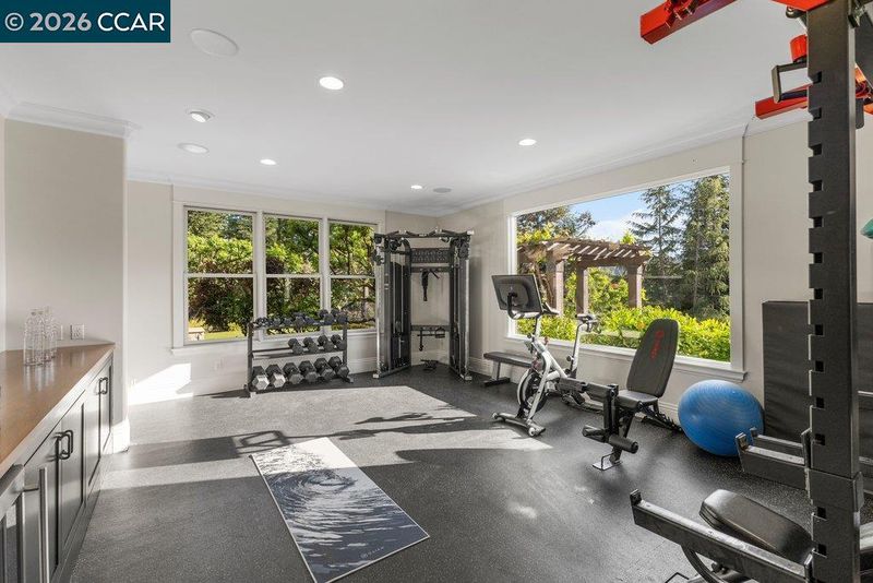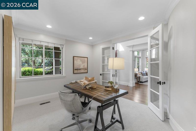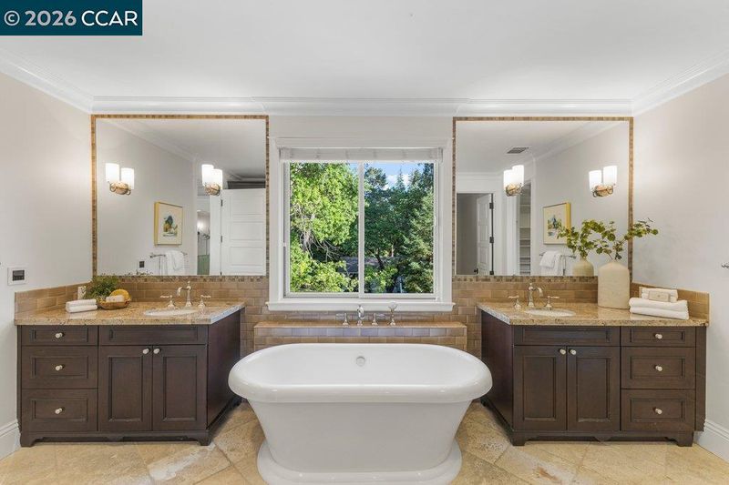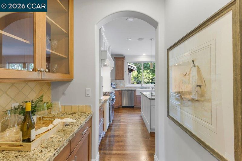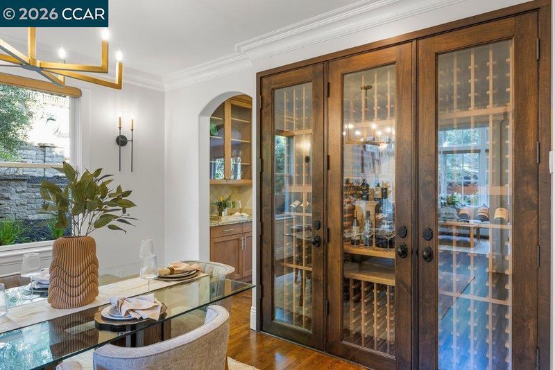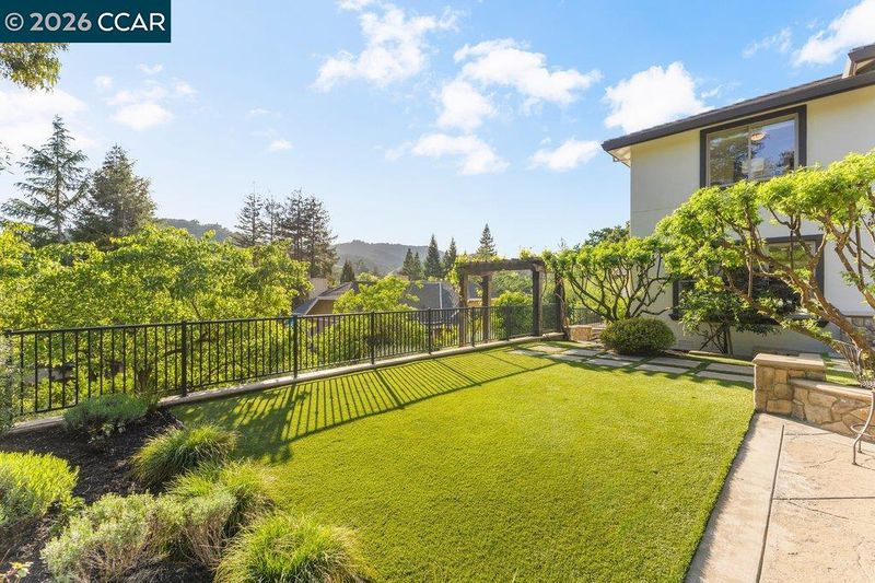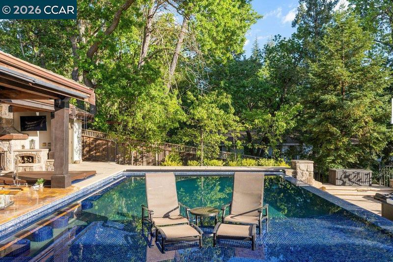 Timeless elegance meets resort-style living in one of Lafayette’s desirable Reliez Valley enclaves. Set on a large level lot with sweeping hillside views, this custom home blends refined architectural detail with an indoor-outdoor lifestyle made for entertaining. Built in 2007 with exceptional craftsmanship, the home offers rich millwork, hardwood floors, and carefully curated stone finishes throughout. The layout is both grand and functional, featuring five bedrooms including a luxurious primary suite and main level guest suite. A large stone island anchors the chef’s kitchen and opens seamlessly to a gracious family room. In the dining room, a custom, thermal-controlled wine wall holds up to 700 bottles—equal parts statement piece and collector’s dream. Step outside into a backyard built for both memory-making and hosting magic. While the kids bounce between the sports area and bocce court, or run wild on the turf lawn, you can harvest herbs from the garden or keep an eye on the fun from the shaded loggia. Cool off together in the pool—little ones love the Baja shelf for safe splashing—while adults unwind at the swim-up bar. Dinner parties flow effortlessly with a covered outdoor dining space and a wood-burning fireplace that keeps the evening cozy.