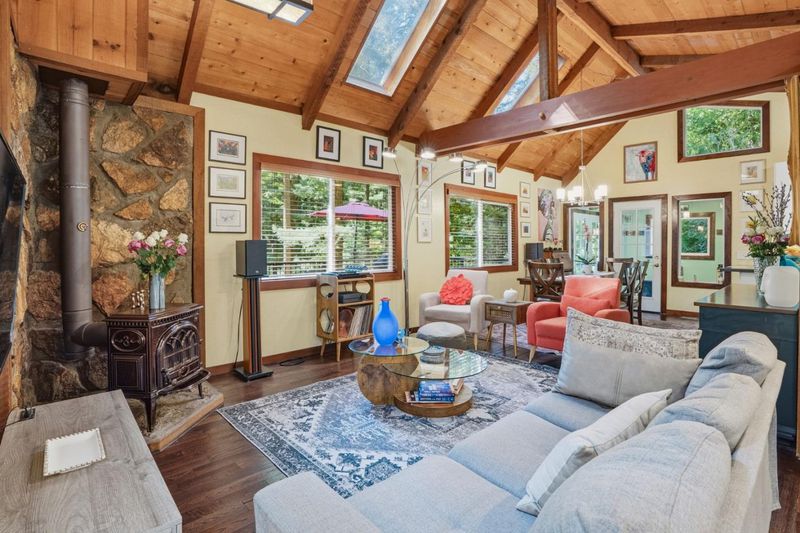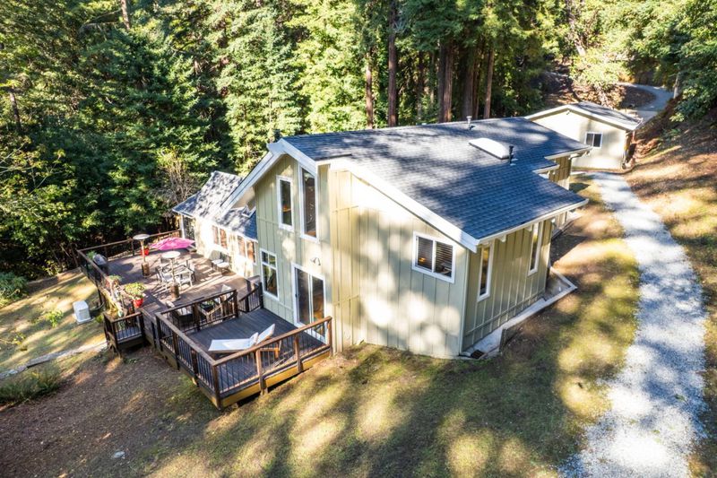 This beautiful home sits on a peaceful parcel offering privacy, open space, & stunning natural surroundings while remaining conveniently close to town.The main level includes living & entertaining. 2 separate entrances: main front entrance & practical mudroom entry, which is especially convenient throughout the seasons and ideal for families.2nd level, includes spacious office w/ large windows overlooking beautiful green meadow, built-in library, & light-filled workplace.Bedrooms are arranged in split-level layout.Exceptional outdoor living with 2 expansive decks ideal for entertaining/relaxing in nature.Plus a detached 2 car garage, storage shed, woodshed, an A-frame studio ideal for use as an art studio, fitness space, meditation room, or private retreat. Home equipped w/ full-house Guardian 22-kw generator, 2nd floor has air conditioning in bedrooms and office area. Heated by a propane powered forced air system serving both floors. The location is very convenient: approximately 10 minutes to Summit Road Exit and about 20 minutes to downtown Los Gatos, with easy access to Scotts Valley or Los Gatos for shopping, dining, and daily needs.This property offers space, privacy, versatility, and beautiful outdoor living, making it a truly special place to call home.