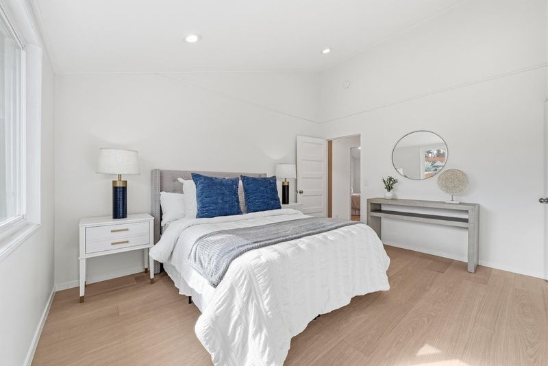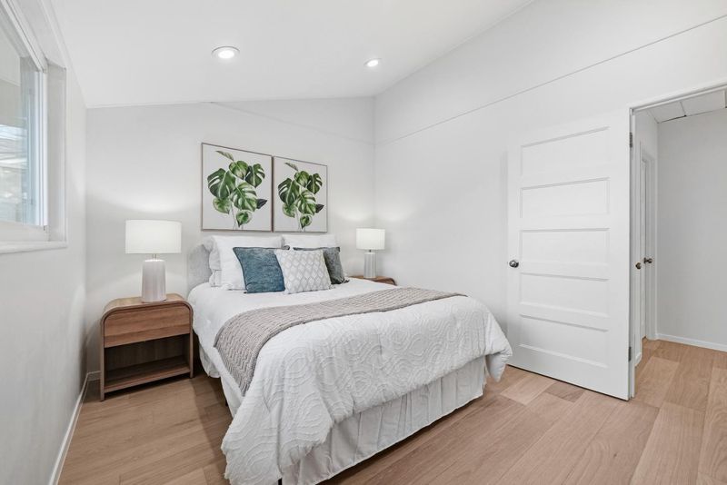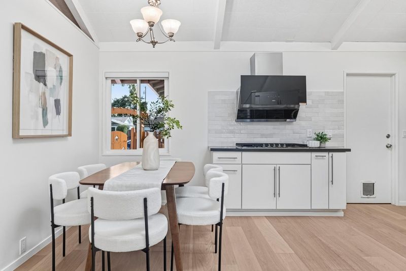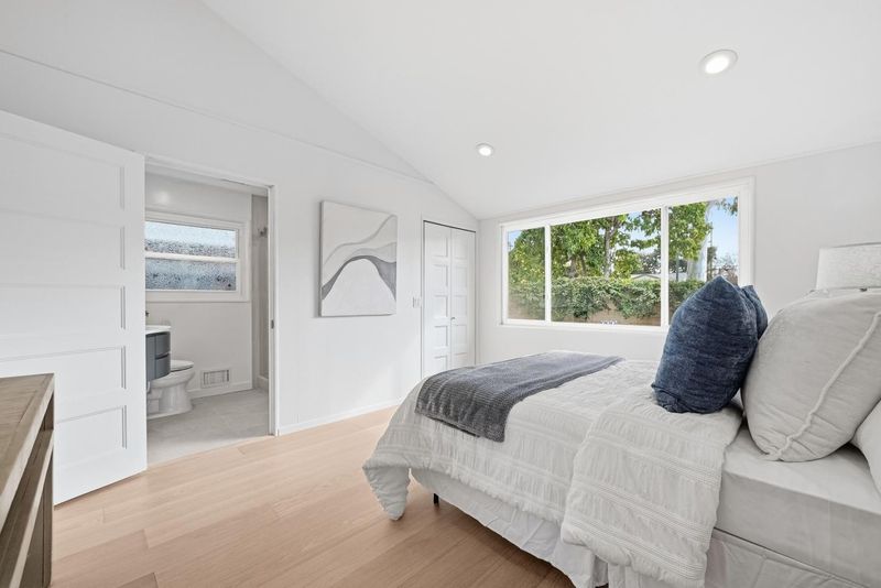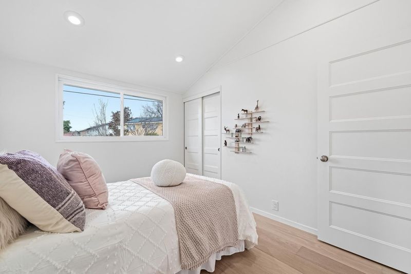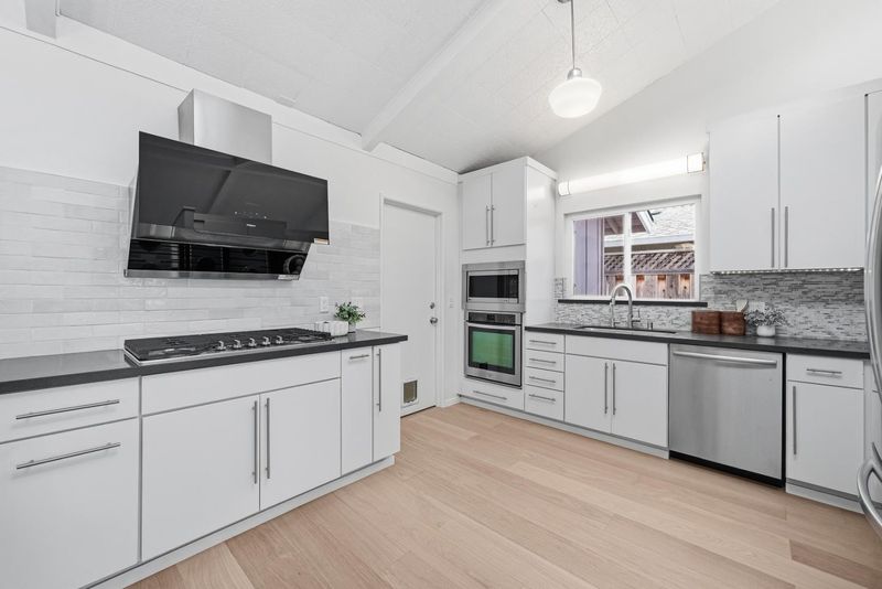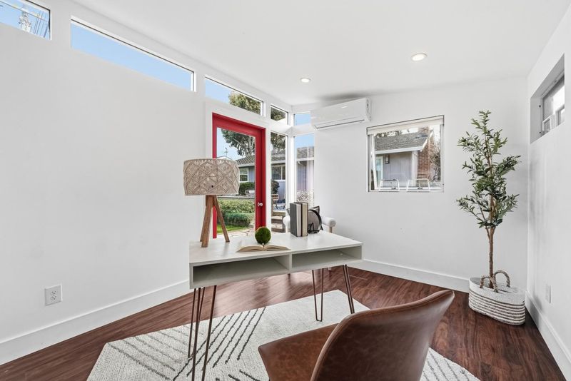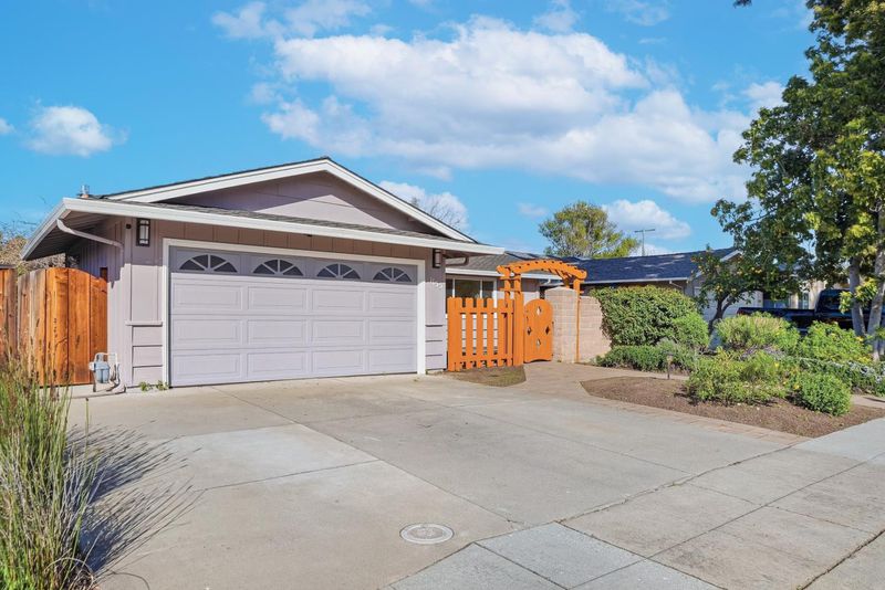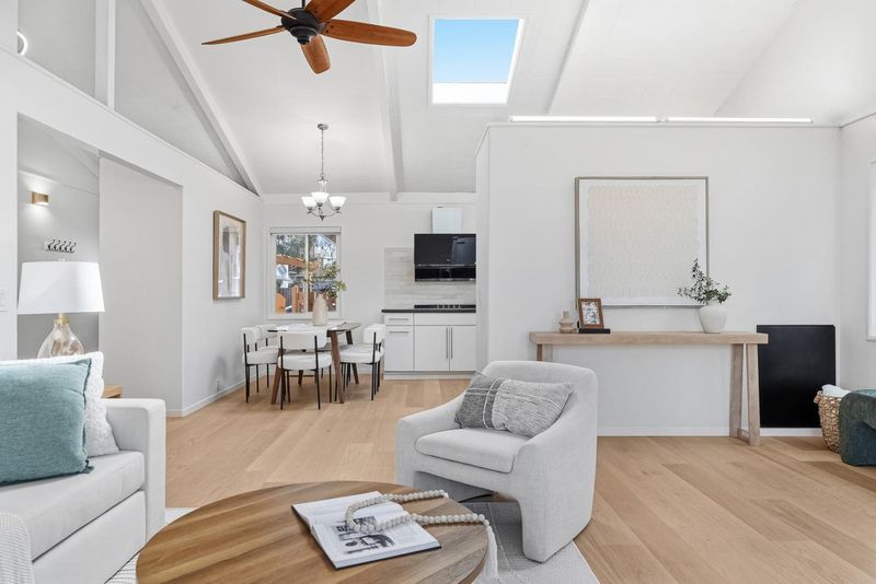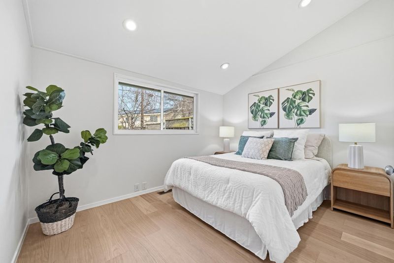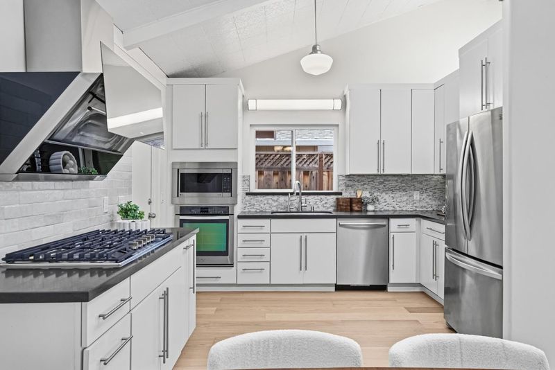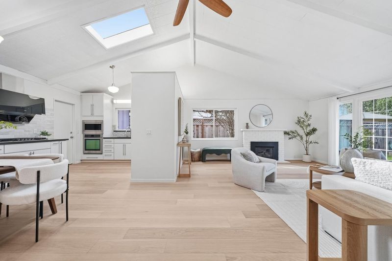 Welcome to this beautiful single-family home in Sunnyvale offering 3 beds, 2 baths, and a backyard studio. A fenced private front yard provides great privacy. Inside, a modern pendant light brightens the foyer, and vaulted ceilings enhance the airy feel. The kitchen and dining area sit under a skylight. The gourmet kitchen features quartz countertops, stainless steel appliances, and ample white cabinetry, with the dining area adjacent. The spacious rear living room includes a cozy fireplace and sliding door to the backyard for indoor-outdoor living. Bedrooms line the hallway. The primary suite offers a vaulted ceiling and updated en-suite bath with illuminating mirror, stylish stall shower, vanity, and smart toilet. Two additional bedrooms serve family and guests. The updated hall bath includes a shower over tub. Recessed lights and engineered wood flooring add style throughout. The backyard studio with A/C is ideal for an office or recreation. Just 5 minutes to downtown Sunnyvale, near Washington Park and Las Palmas Park, diverse restaurants, Trader Joe's, Whole Foods, Safeway, Target, and Sunnyvale Caltrain Station. Easy access to Hwy 237, 85, and Central Expressway, short commute to major tech companies, and top-rated Homestead High School. Do not miss this opportunity!
