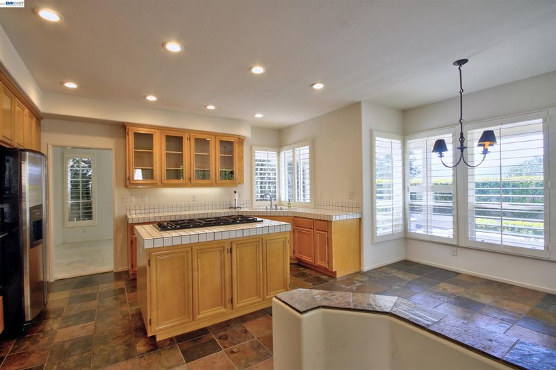 - Range, Refrigerator, Tile Counters, Kitchen Island, Range/Oven Built-in