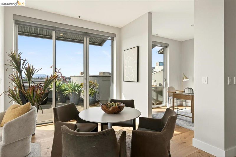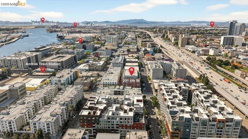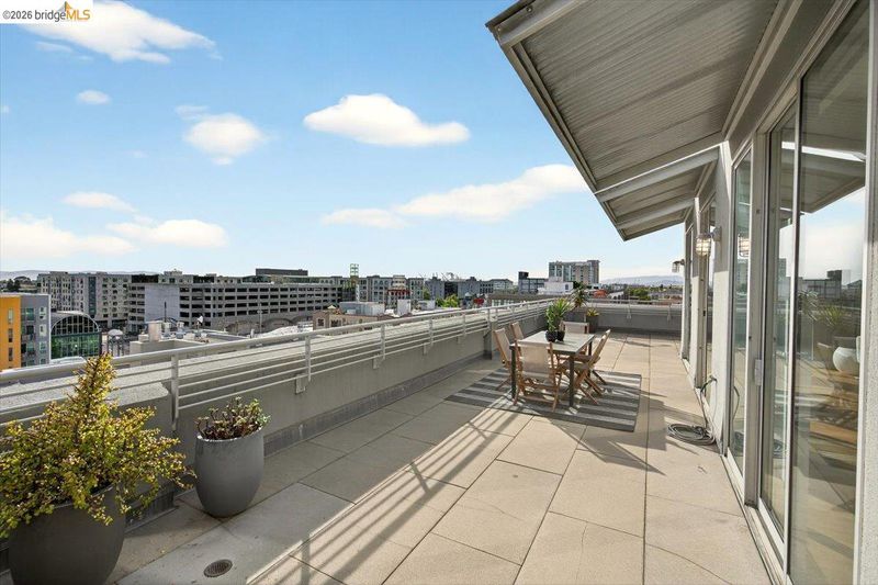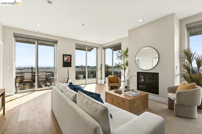 Loft-style penthouse at 201 4th Street #601 in Oakland’s New Market Lofts. This top-floor residence offers approximately 1,360 sq ft of interior space and an generous ~900 sq ft private patio with southwest and northwest exposure, featuring afternoon sun and San Francisco skyline and Bay views. Rare indoor-outdoor living in a prime waterfront location. Interior features include heritage French white oak flooring with oil-rubbed and baked finish, Siemens washer and dryer, Bertazzoni kitchen appliances, and abundant natural light throughout. Additional highlights include two parking spaces and convenient access to BART, freeways, Jack London Square dining, Sunday farmers market, and the ferry to San Francisco.