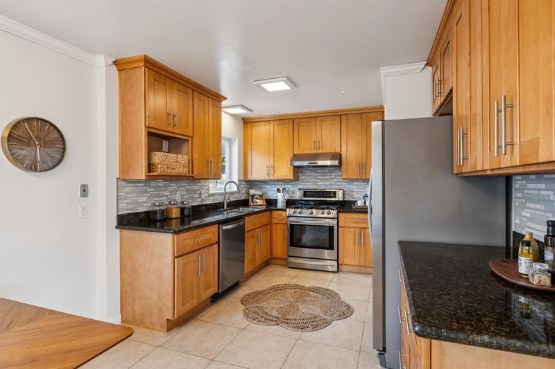 Updated 3 bed/ 2 bath home with den, office/guest room, and 2 car garage. Open kitchen/ dining/ living room & sliding glass door to patio and yard. Living room with lustrous oak floors, fireplace, and wall of windows. Dining room opens to gourmet kitchen, granite counters and stainless steel appliances, including gas stove and dishwasher. Primary bedroom has bathroom with tiled walk-in shower. Large hall bathroom with granite topped vanity and enclosed shower/tub. All bedrooms have oak floors and lovely windows. Downstairs is a stylish den, plus the office/guest room. Both with luxury vinyl flooring. 3 closets, lots of light, and yard access. Space for extended family, home office, hobbies, or home theater. Gardens and patios surround the property, landscaped terraces, and open green space in the fenced backyard. 2 car garage with interior access + high end washer/dryer. Recent permitted upgrades include new furnace (2026), roof (2025), and 200 amp electrical panel (2020). Dual pane windows and new doors throughout, which keep the home cozy. Near 580/80, BART, El Cerrito Plaza, shopping & restaurants, Costco, Ranch 99. Zoned for Korematsu Middle and El Cerrito High per WCCUSD website. Buyer to confirm, if desired. Some special loan options available, inquire.